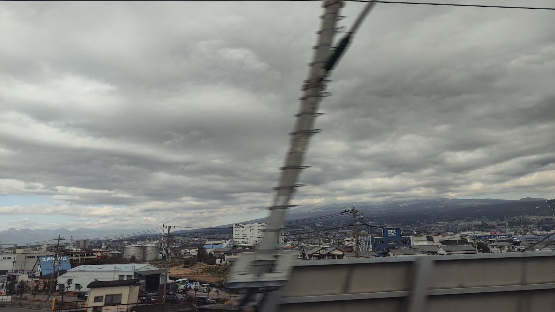 东京到大阪方向的路上可以近距离看到富士山,可惜那天的天气不太好,下图中云后面隆起的那座山就是。