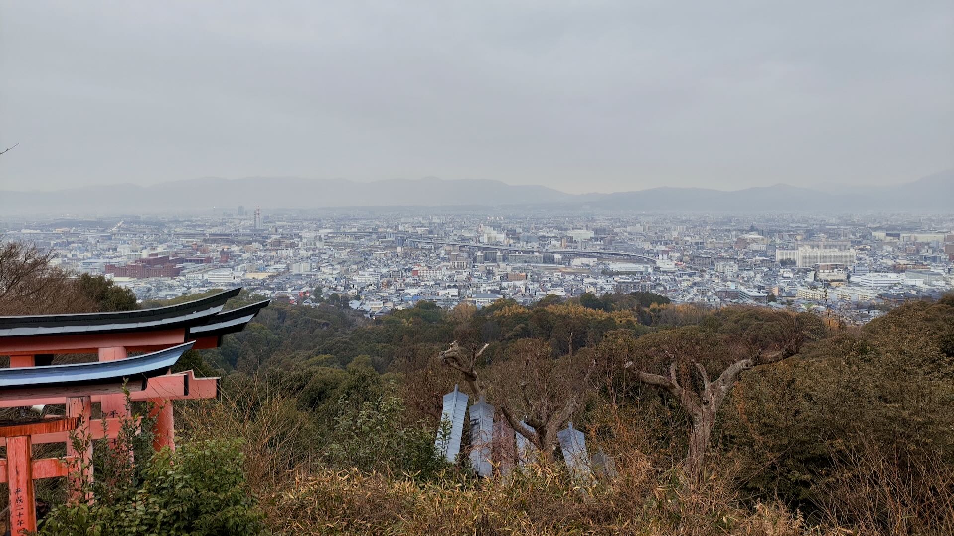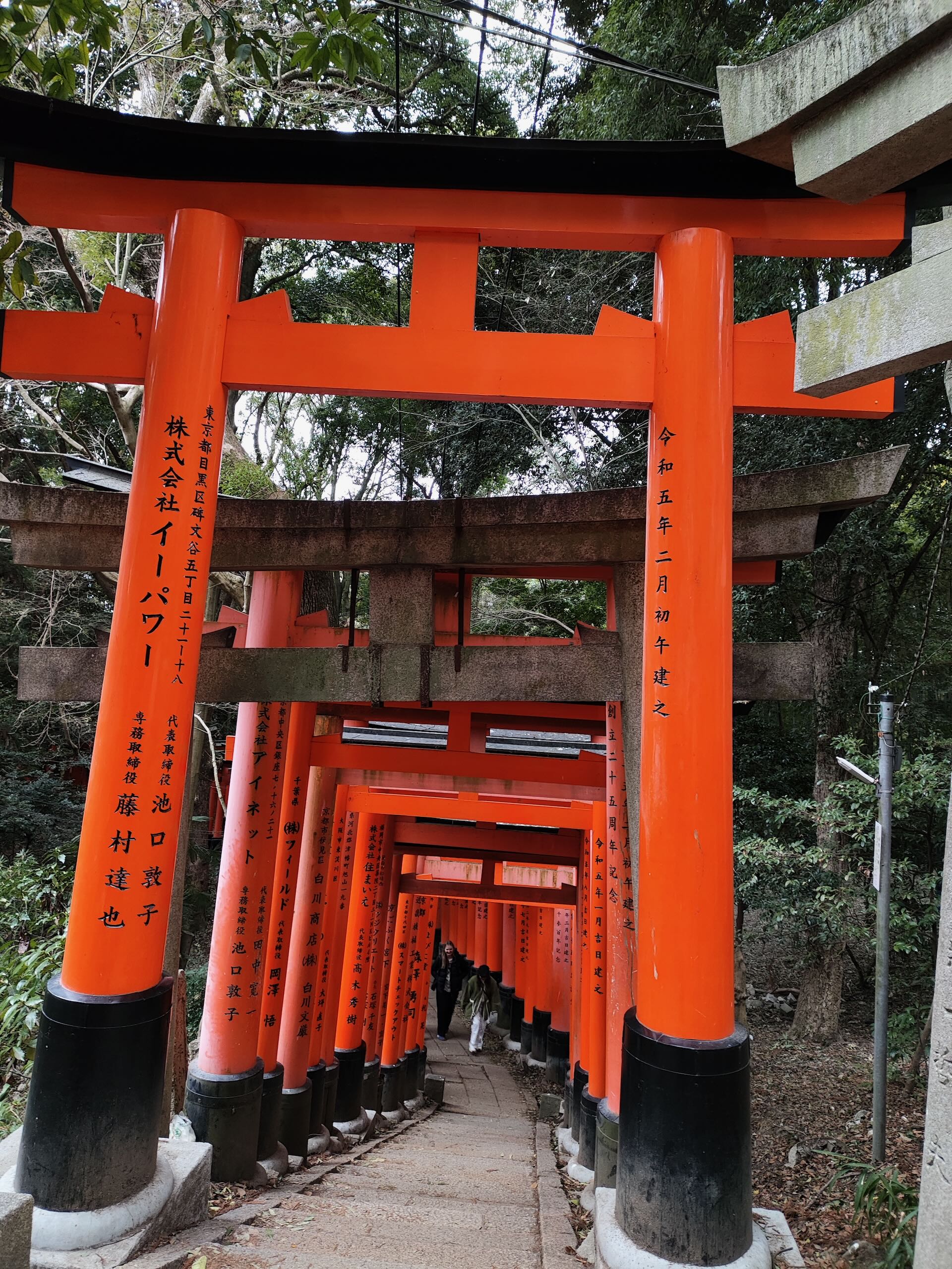 东京到京都要差不多两个半个小时,到那边已经是中午了。中午吃了猪排饭,炸猪排和炸虾,配包菜丝和蘸酱。因为第二天就去大阪了,所以只去了千本鸟居⸺伏見稲荷大社。那里是神社里的一座山,爬山路上全部立满了鸟居,基本整座山的路上都占满。而且还有不断新立的鸟居,大多都是一些公司赞助。