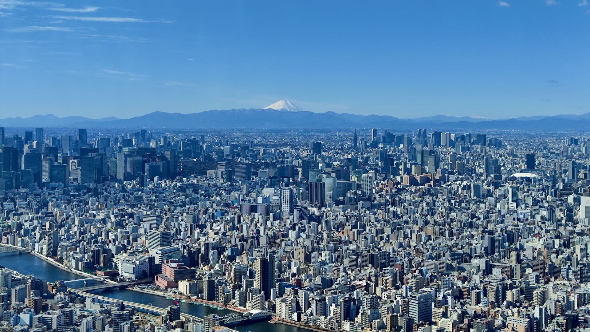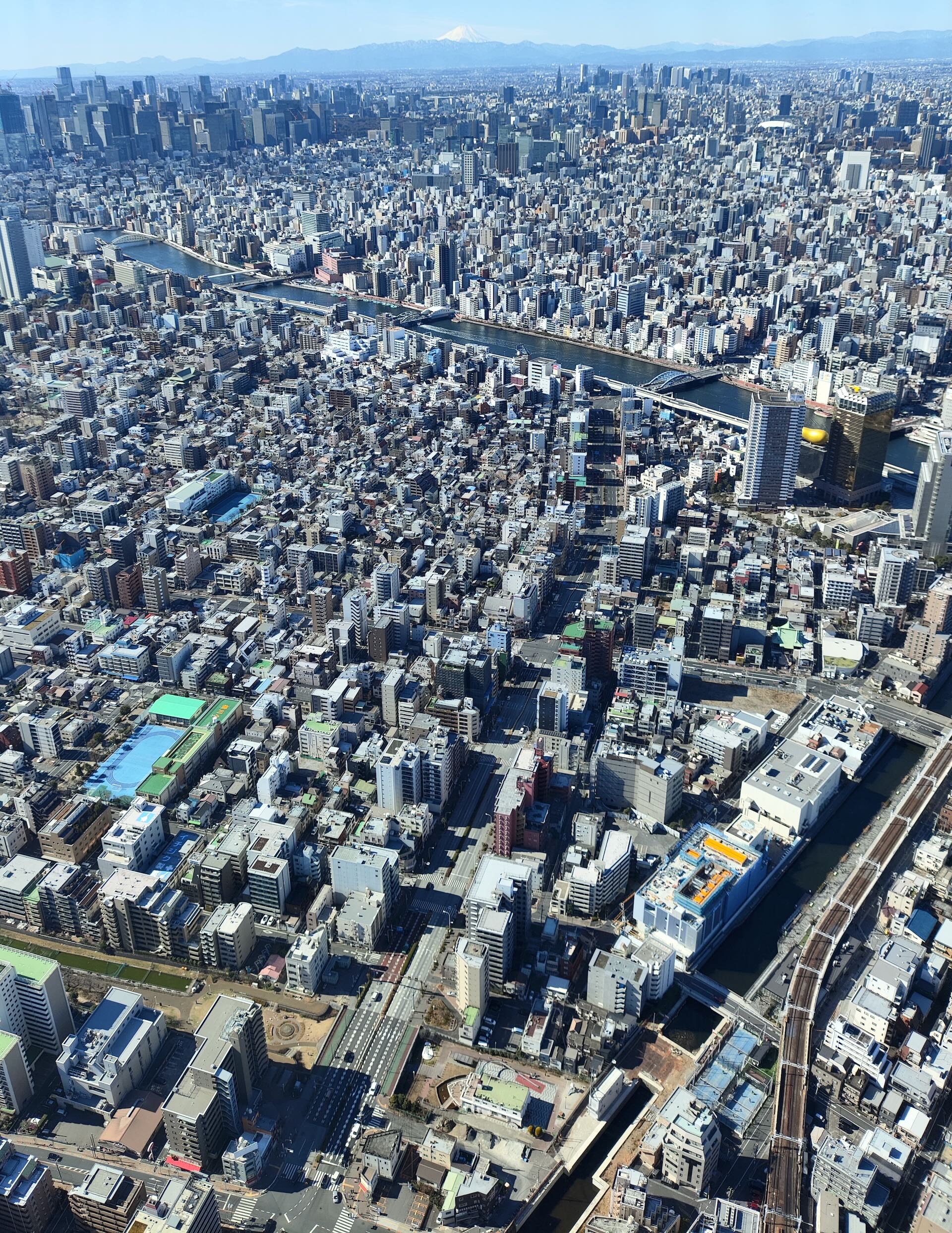 来到晴空塔上看鸟瞰,就会感受到东京一望无际式的摊大饼。看起模拟城建游戏里高密度画格子画出来的模型的感觉。那天的天气很好,可以一直望到远处的富士山,