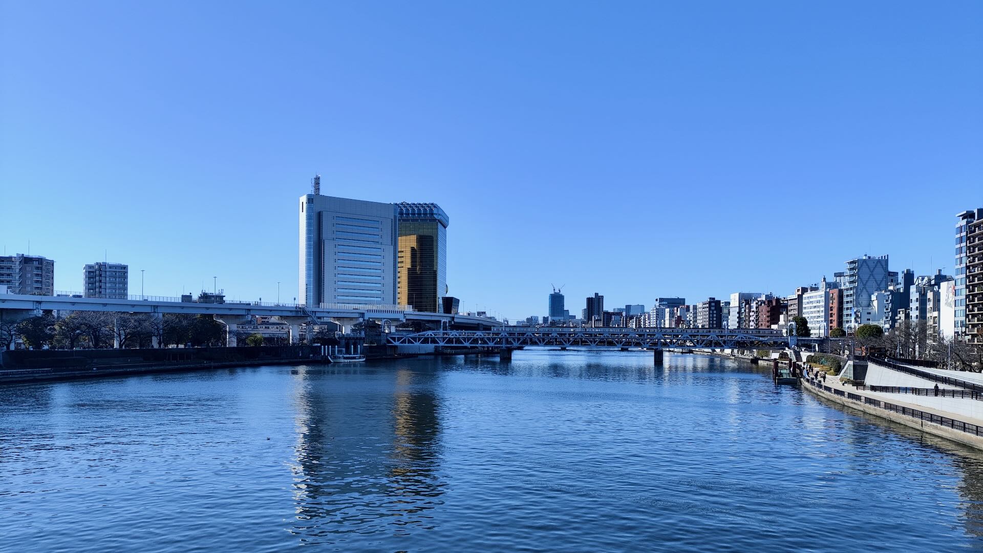 从浅草出来之后,步行到晴空塔。经过东京最主要的一条河,隅田川。