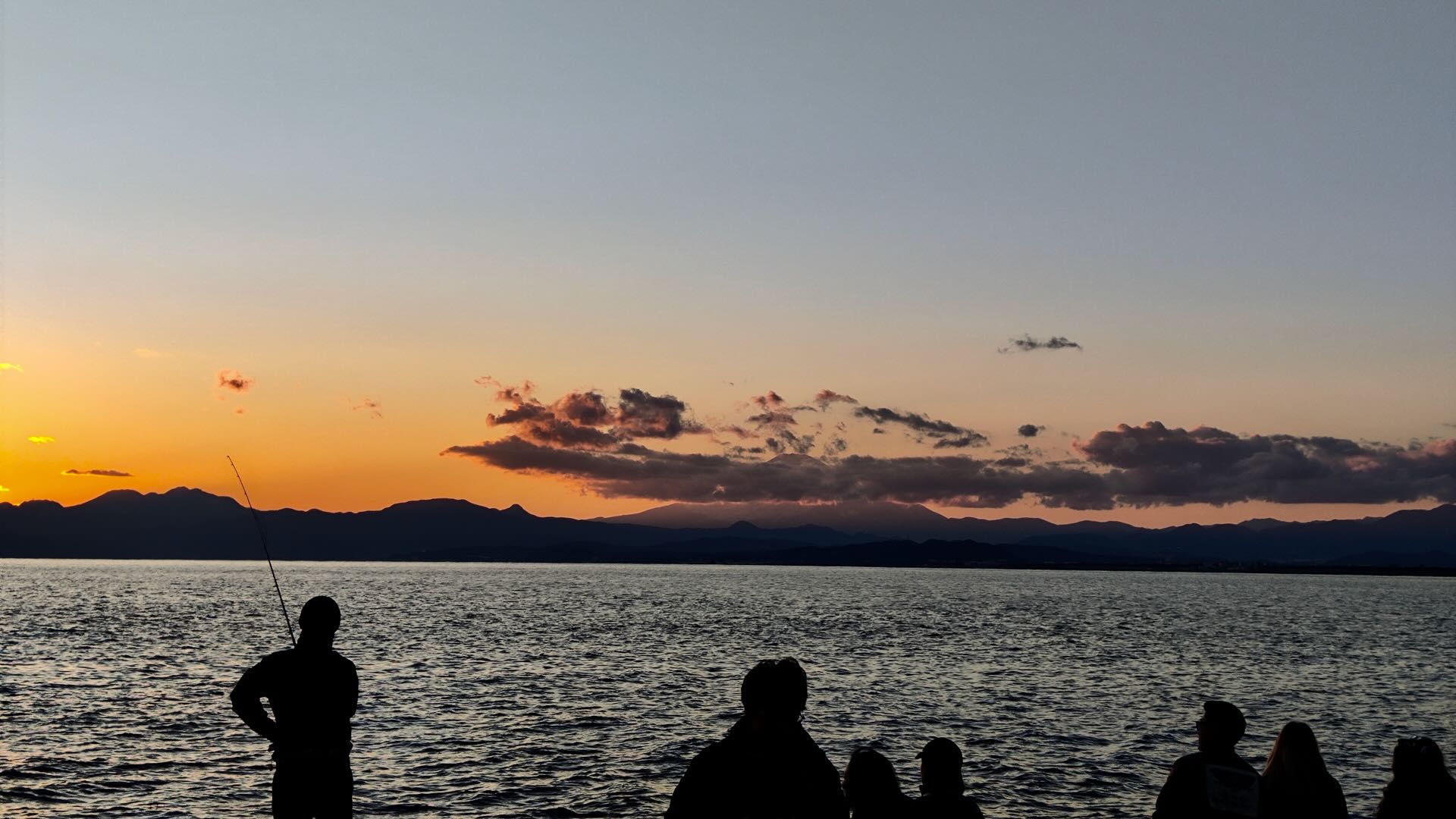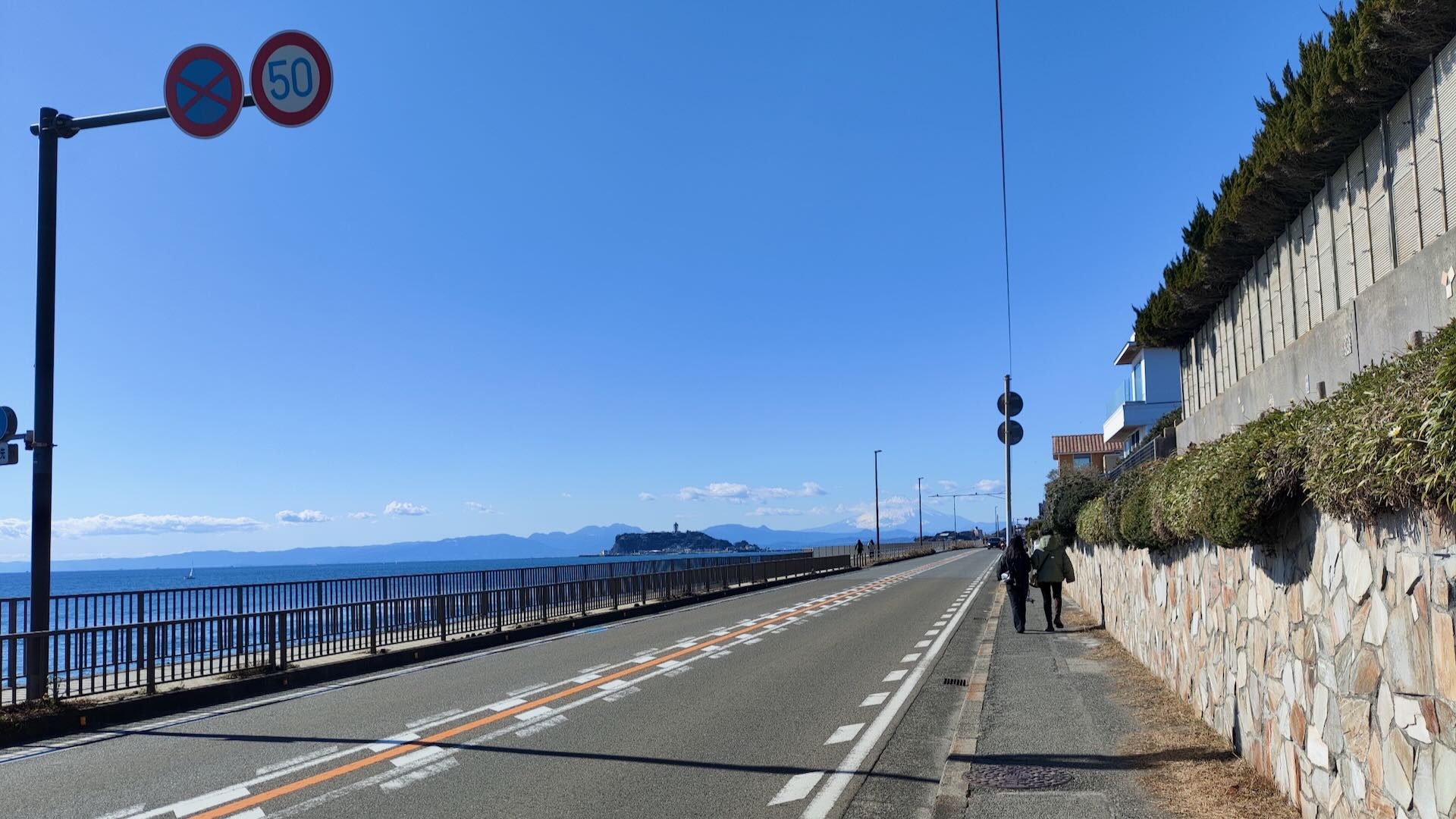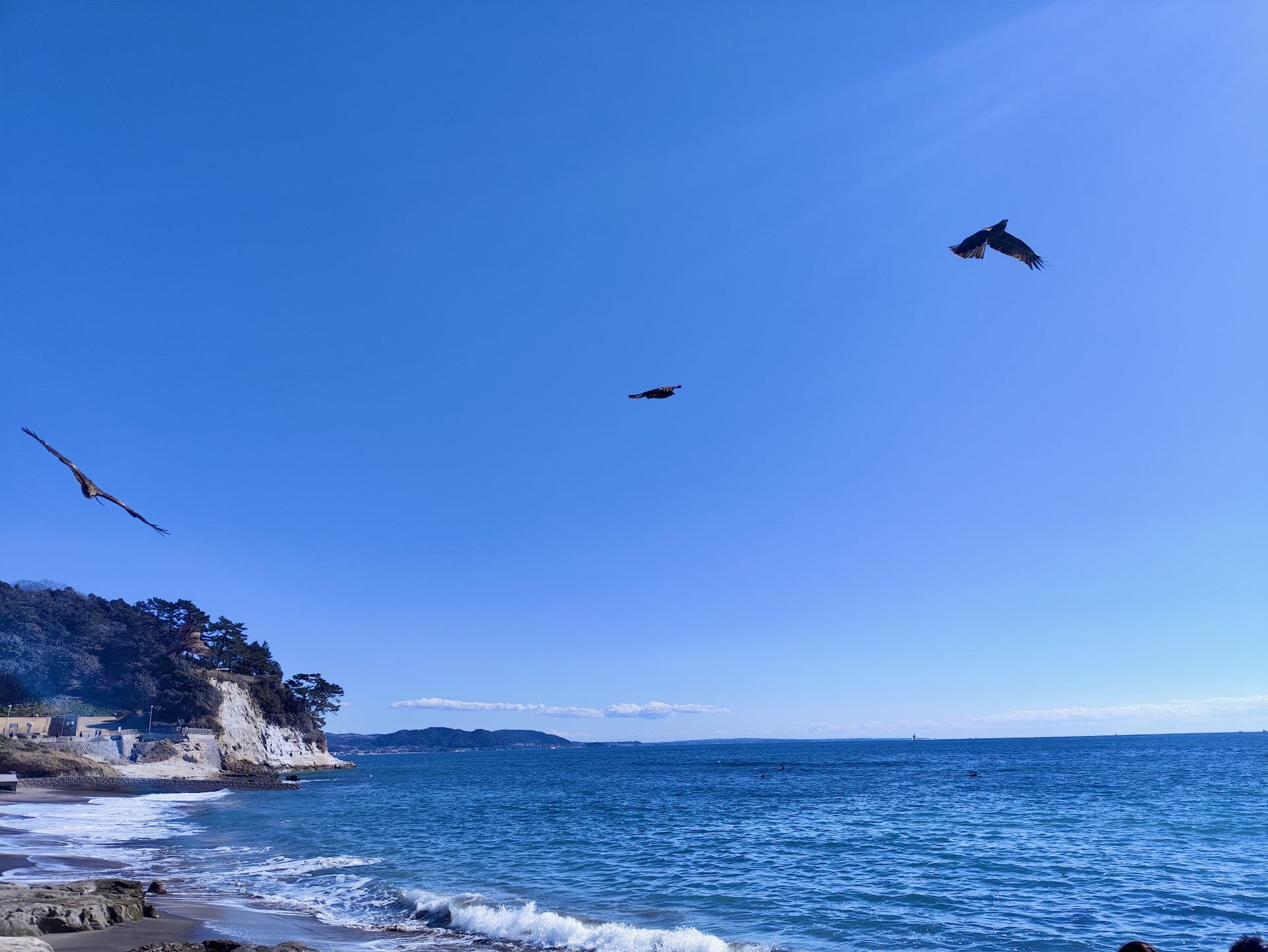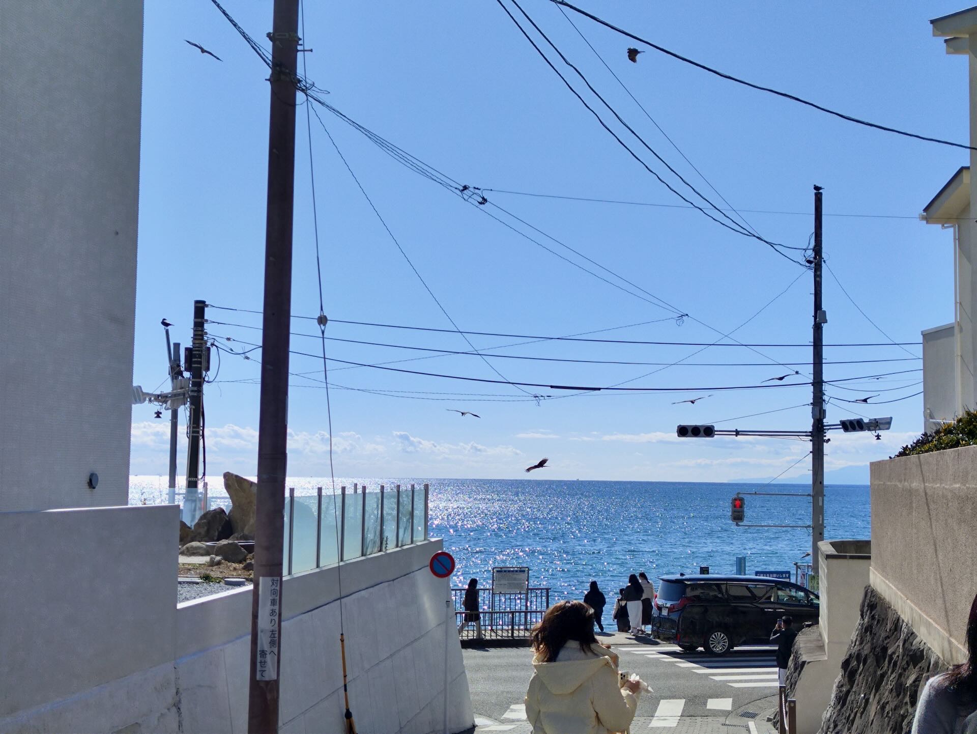 从镰仓出发坐一段路就到了海边,虽然我也勉强算是在海边长大,但是浙江的海,受到地理因素影响,那就是黄泥水。当我们在稲村ヶ崎下车,路口转角,迎面而来,豁然开朗的感觉。第一次看到真正一望无际的蔚蓝的大海。沙滩(不知道为啥是近看沙子其实是黑色的)、蓝天、海鸟(竟然是老鹰)、海浪和吹来的海风,再来几棵棕榈树就是完美的大海刻板印象了。